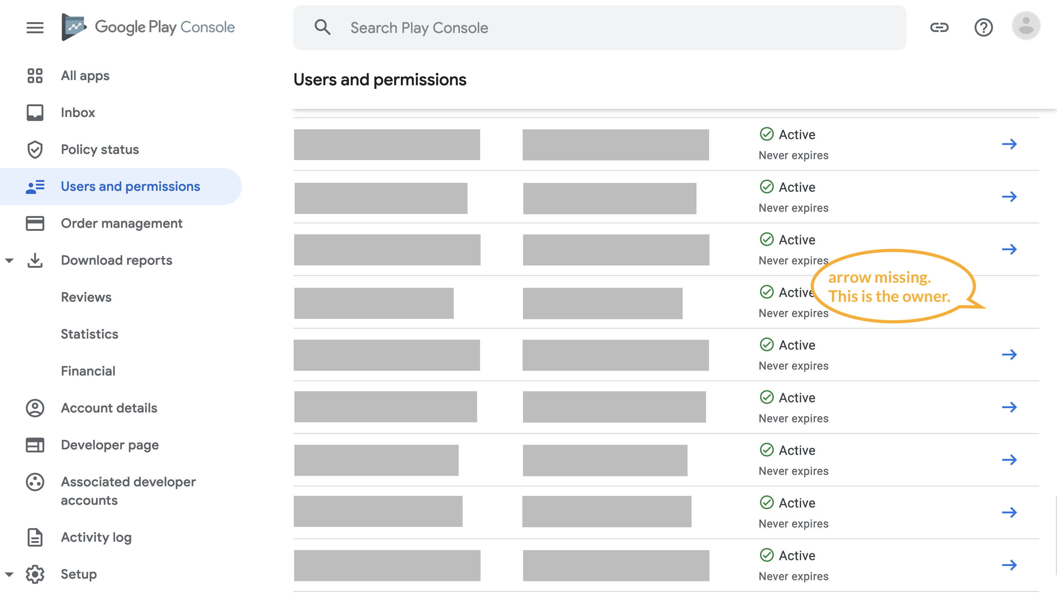 Open the Google Play Console, select your Developer Account, and click on “Users and permissions”. All users will have a blue arrow at the right. All users, except for one: The Owner Account! So watch out for the user without a blue arrow; This is the Owner Account you’re looking for!